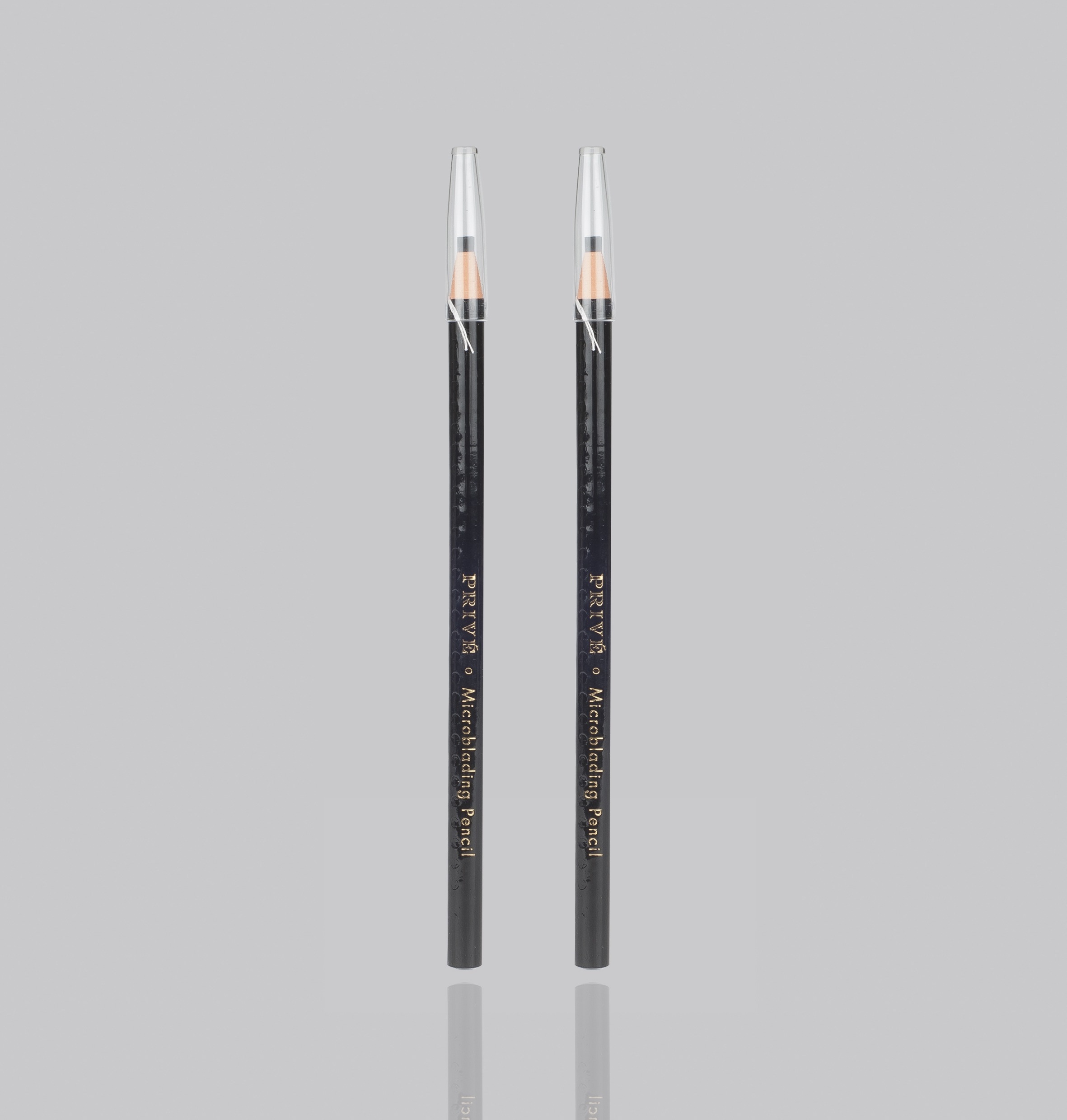 The pencil is used for creating shapes before drawing in the hairs. It differs from ordinary pencils due to its flat surface which, when using the edge, ensures that the new shape or outline of the eyebrow is drawn accurately.